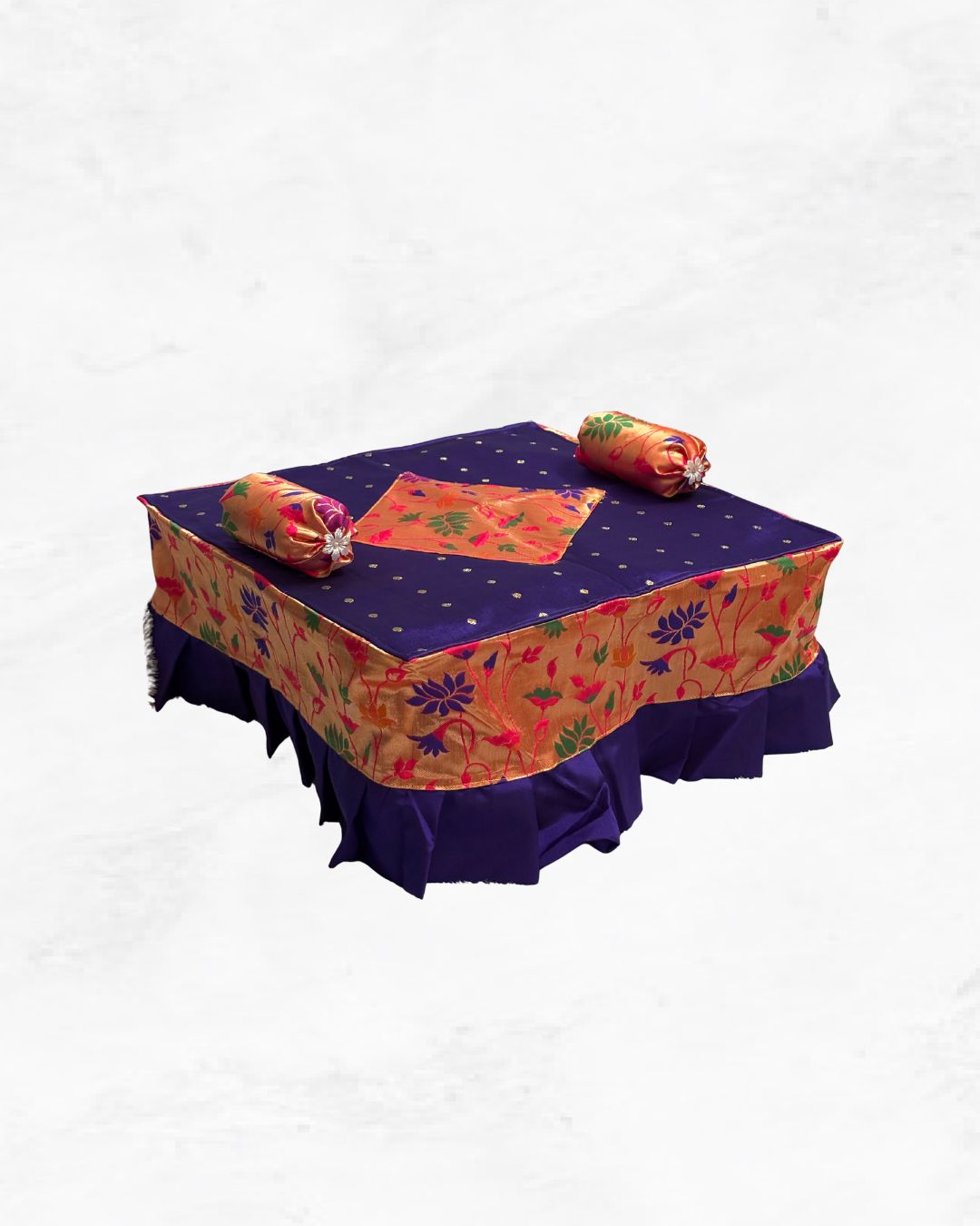 The base material of the Paithani Chaurang Cover is soft silk—lightweight, elegant, and lustrous. It’s easy to fold and store while still giving a rich, festive appearance whenever laid out. The silk complements the zari border beautifully, making this cover feel premium.